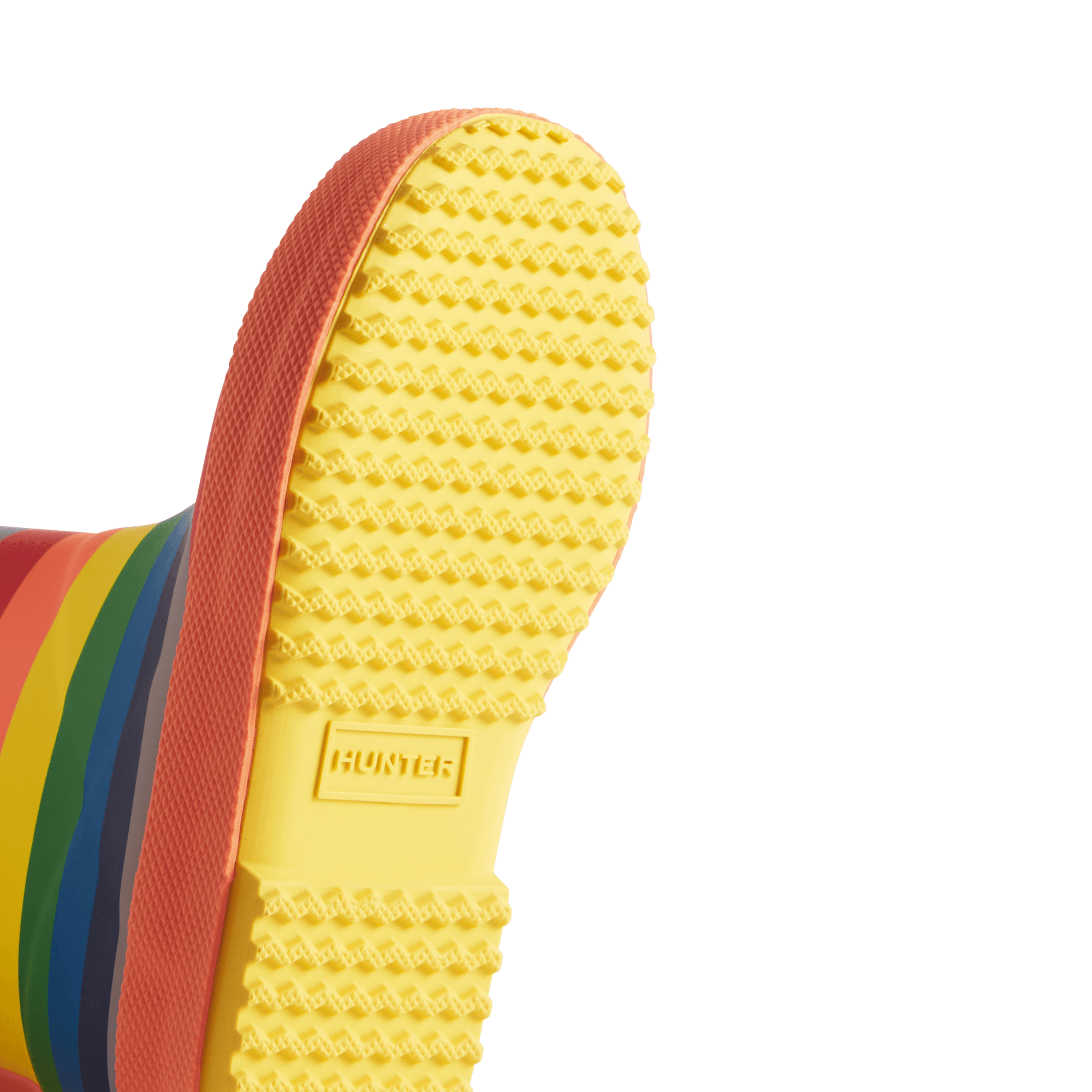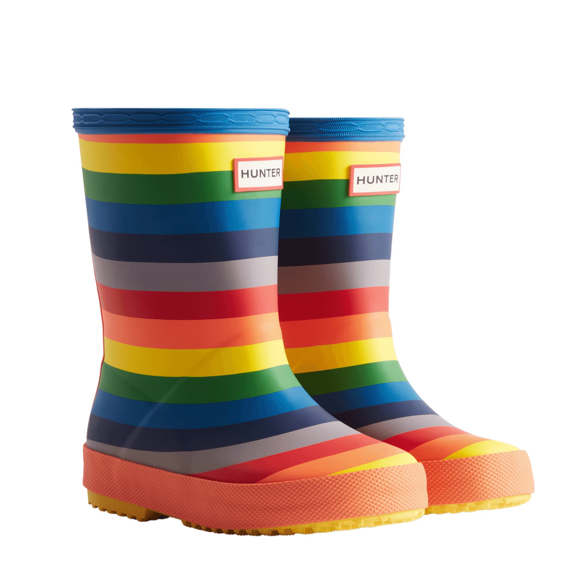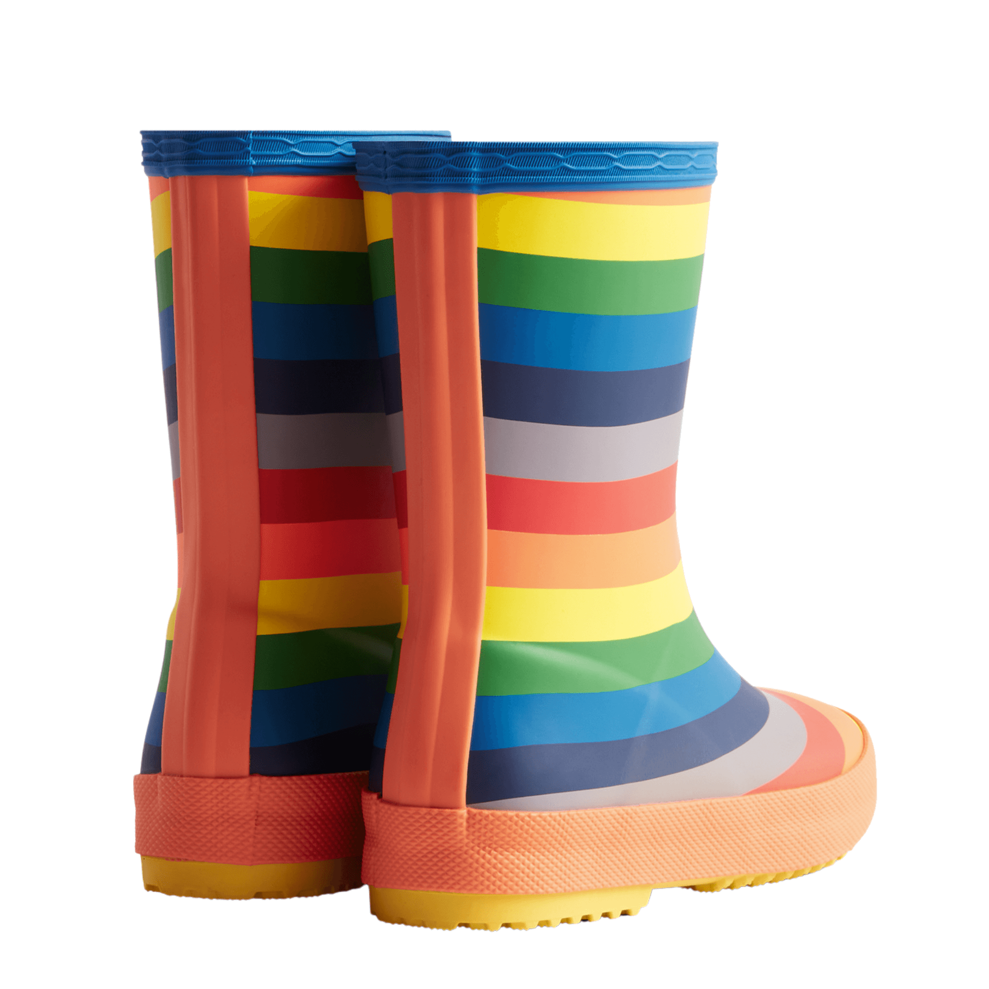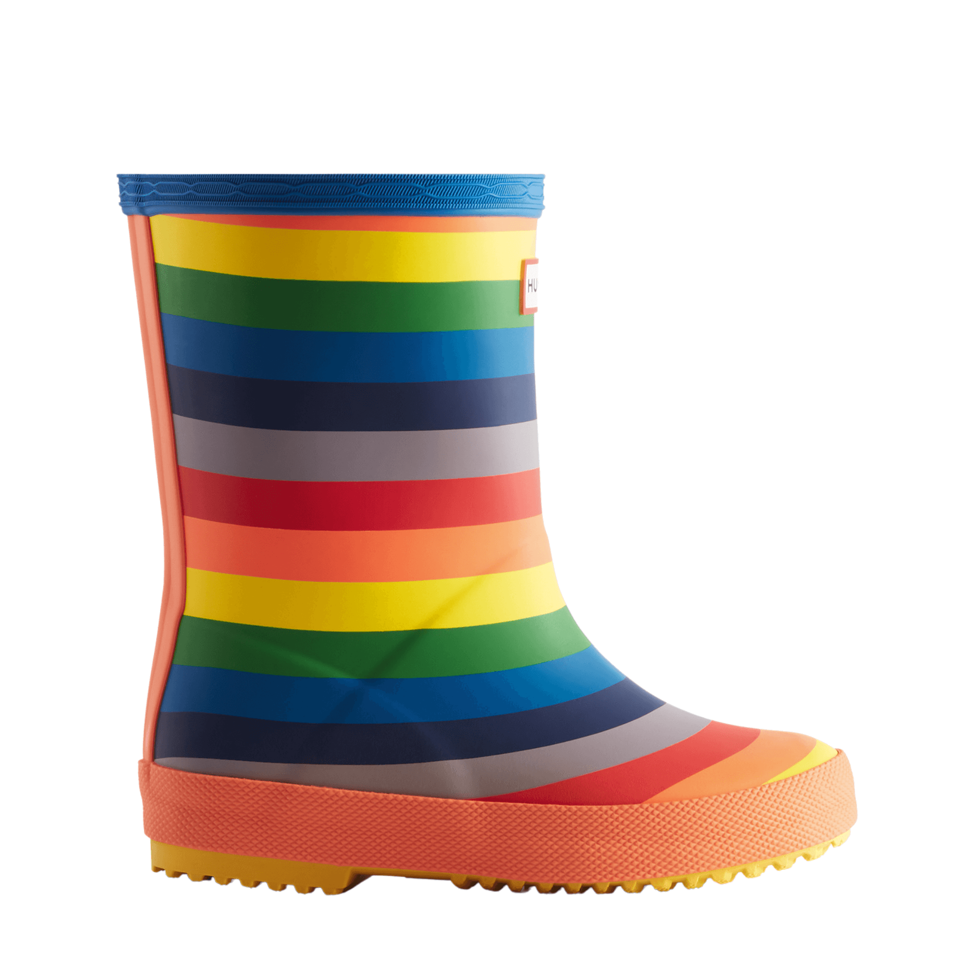 The Hunter Kids First Classic Wellington Boot has been updated with a new and improved sole. Perfect for puddle splashing, these kids rainbow welly boots are handcrafted from natural rubber, fully waterproof and feature a specially developed deeper textured/zigzag tread to reduce slipping. With a 100% recycled polyester lining and rounded toe which gives little feet room to move, it ensures complete comfort for every adventure.