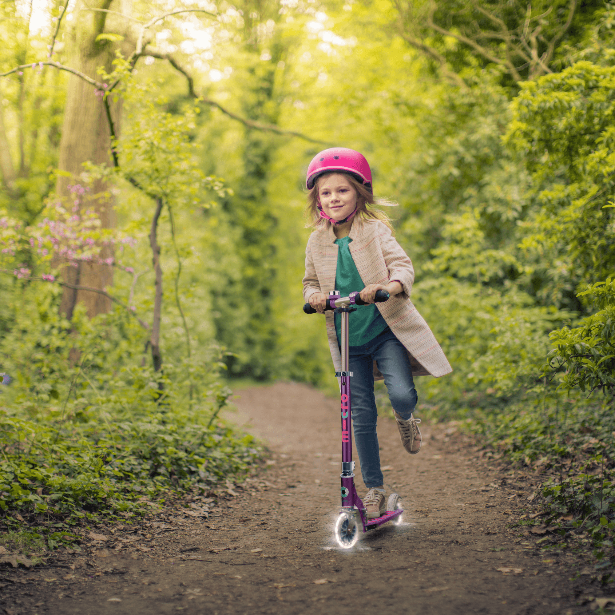 The Maxi Micro Light up wheels scooter has been designed to brighten every day. The smart light up LED wheels use induction energy to turn the power kids create as they scoot into bright white light. No batteries. No fuss. Just a glow to light up the darkest evenings and brighten up the most ordinary days.