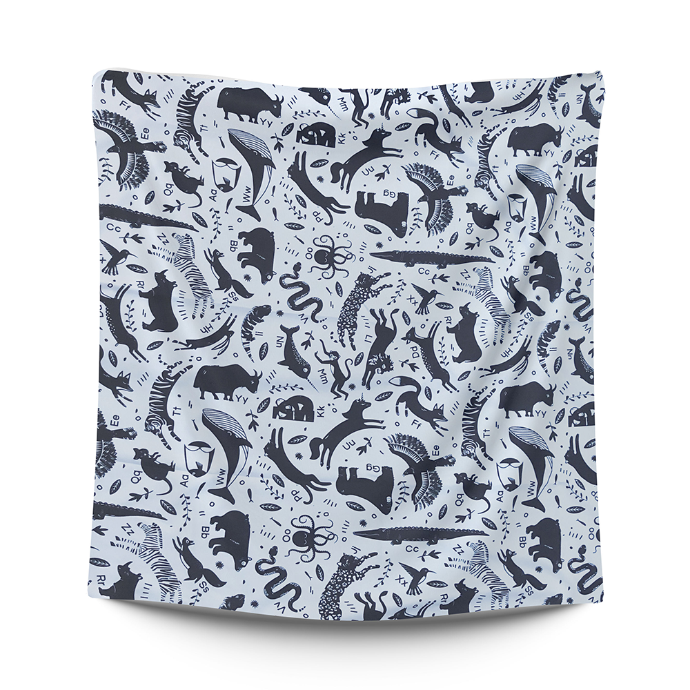 A fun, animal alphabet print. An animal for each letter. F is for Fox, E is for eagle, Z is for zebra. The whole alphabet is featured on the blanket.