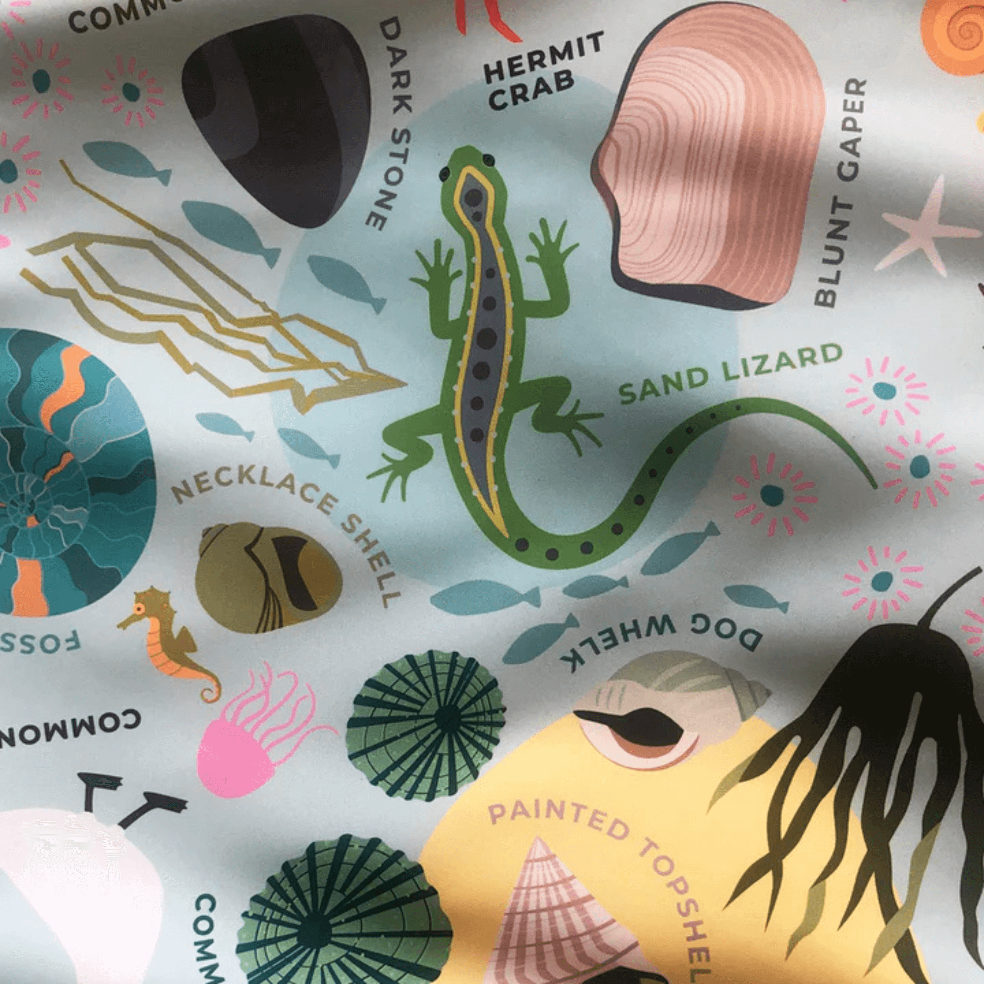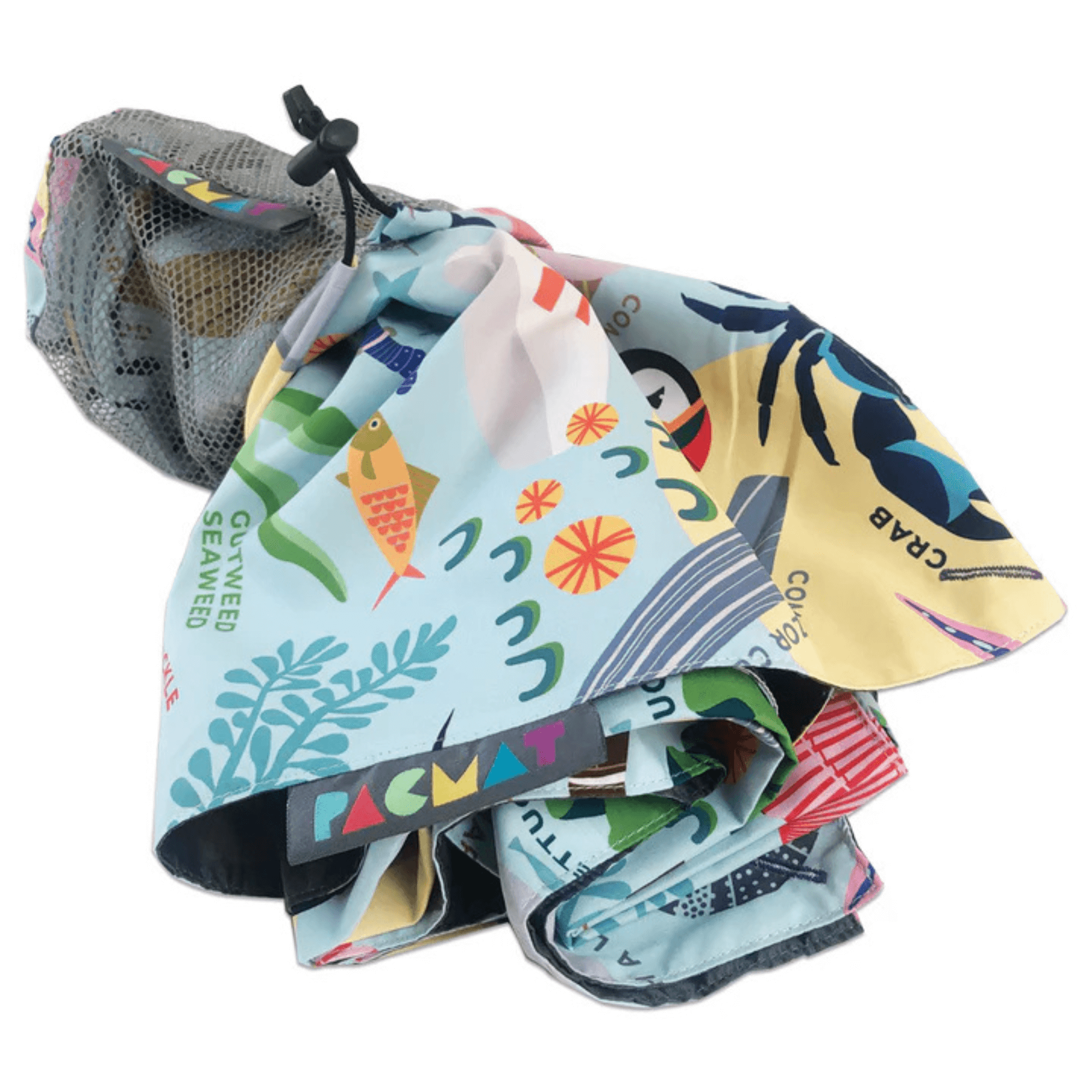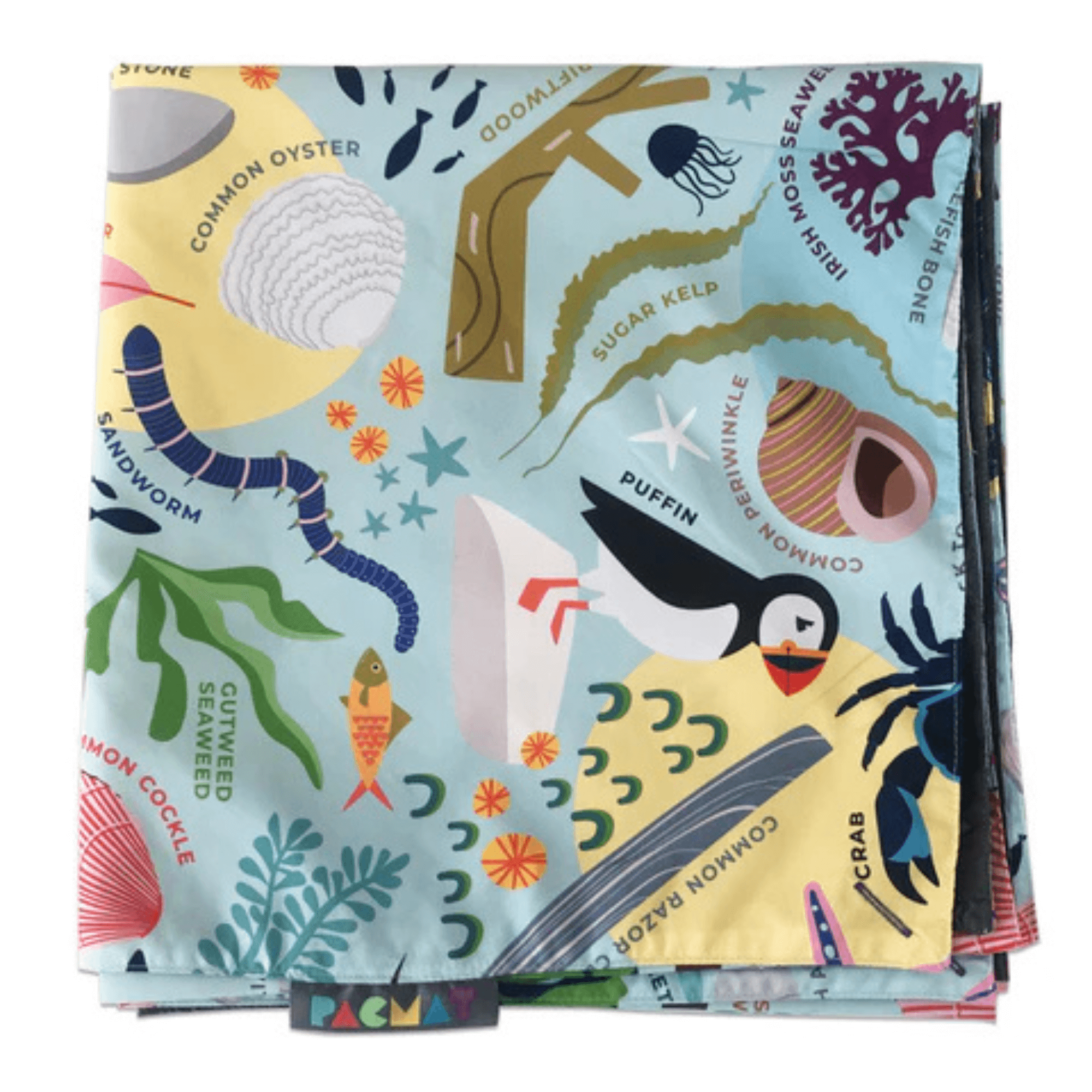 A beach mat for the family. Get the kids exploring the beach and rock pooling. Find a pebble for a game of beachcombing. Throw for a turn and whatever it lands on everyone must go off and find. Featuring a pattern of star fish, limpets, urchins, whelks, crabs, sea weed, puffins and more.